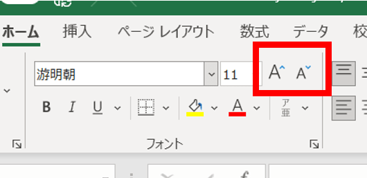 文字サイズは、セルがアクティブになっている状態(枠が太線になっている状態)で、「フォントサイズの拡大」「フォントサイズの縮小」ボタンを押せば調整できます。