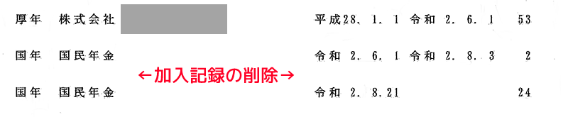 そのため、令和2年8月は、途中退職した期間後に加入した国民年金保険料を支払った国民年金となっております。そこで、会社に対して保険料の還付が行われたことで、厚生年金の加入記録が削除されました。