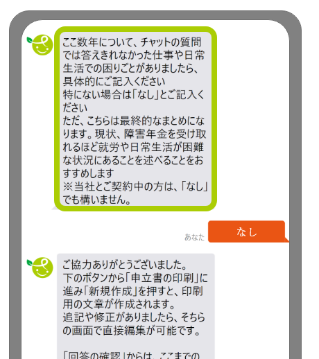 ご自分のペースでチャットの質問に答えていくだけで、「病歴・就労状況等申立書」についての情報を、当社宛に提供することができます。