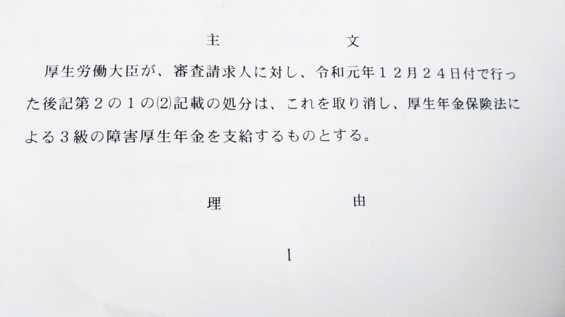 結果は、請求側の主張が認められ、保険者(厚生労働大臣)の認定日不支給決定を取り消し、障害厚生年金3級を支給する旨が記載されていました。