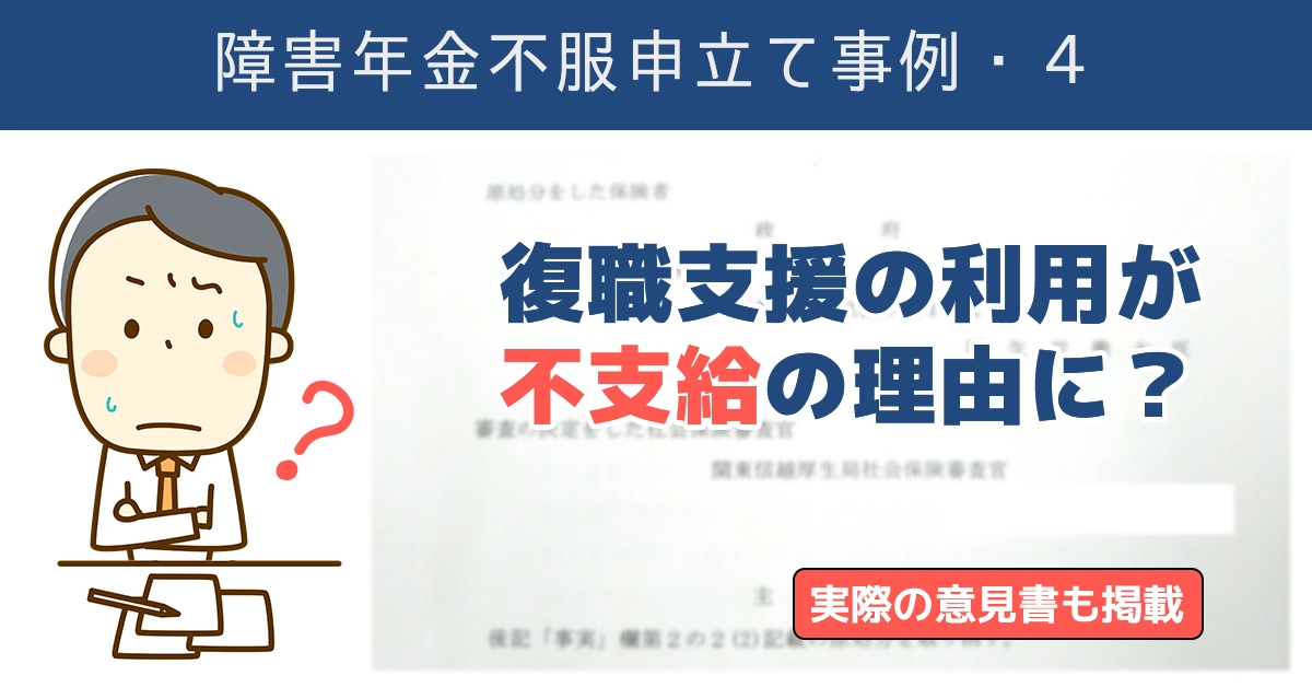 保険者は、障害認定日(平成25年11月〇日)において請求者が休職中であることを認めているものの、平成27年3月〇日に復職後、平成30年10月まで厚生年金被保険者であったことを不支給の理由としている。