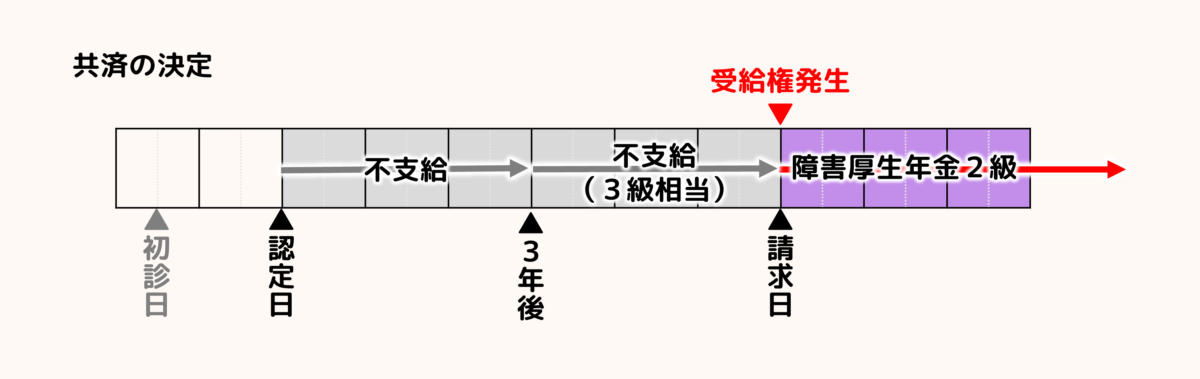 認定日不支給/事後重症の図申請した結果、現在の障害状態は認められましたが、認定日は不該当、その3年後は3級相当、現在は2級で認定されました。