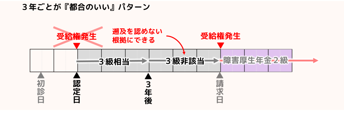 それは、認定日で受給権が発生しても3年後で不該当だった場合、障害状態が継続していないとして、遡及を認めないためではないかと想像します。