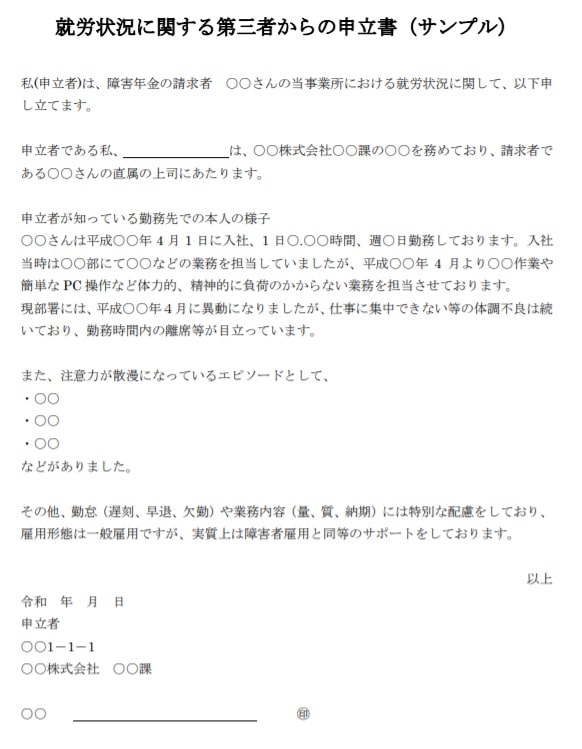 一般雇用だけれども、合理的配慮を受けているという場合、当社では、病歴・就労状況等申立書とは別に、「就労状況に関する第三者の申立書」を準備しています。