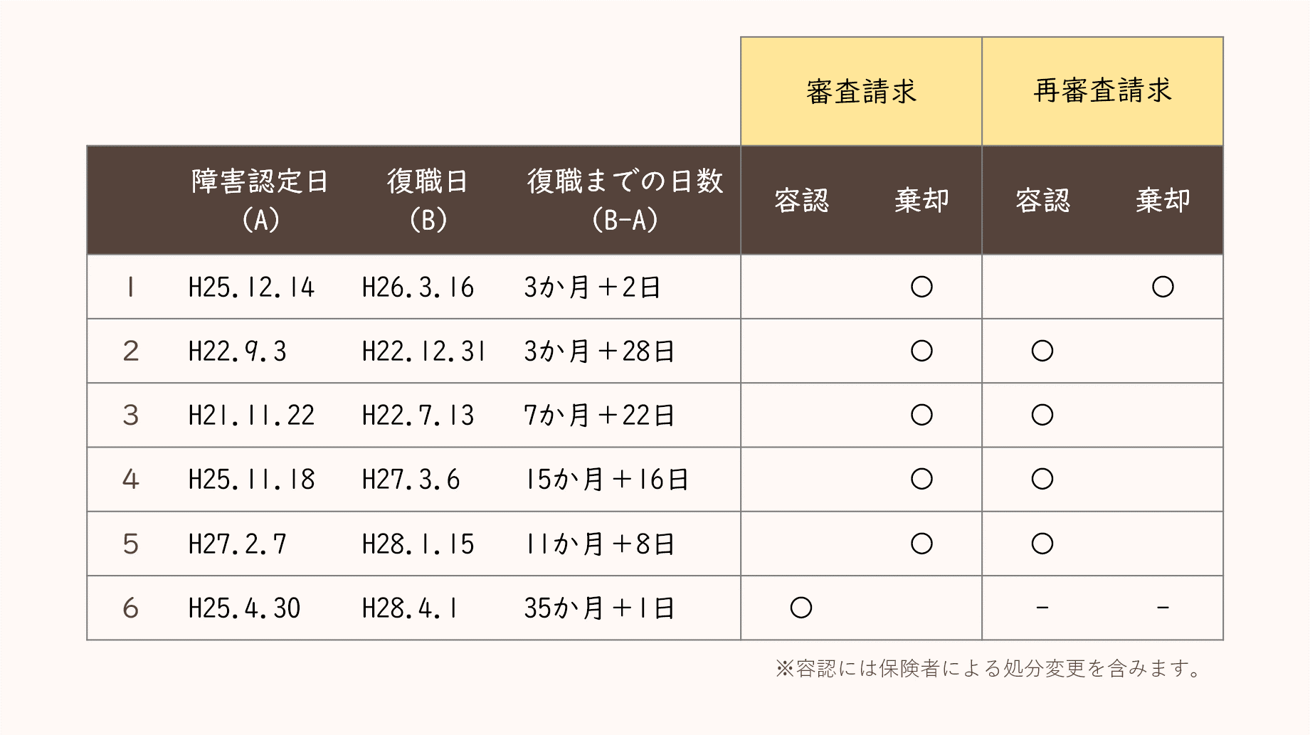 そうすると、容認で復職期間が短い3(7か月+22日)と棄却された1(3か月+2日)の中間である5~6か月が容認/棄却ラインであることが分かります。