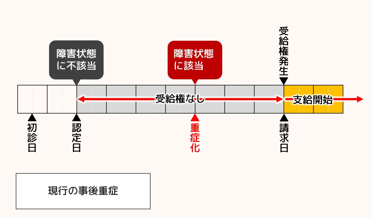 そうすると、障害状態が重くなった瞬間に事後重症請求しなければならず、相当な期間、障害等級に該当しているにも関わらず障害年金を受給できないが存在していることが現状です。