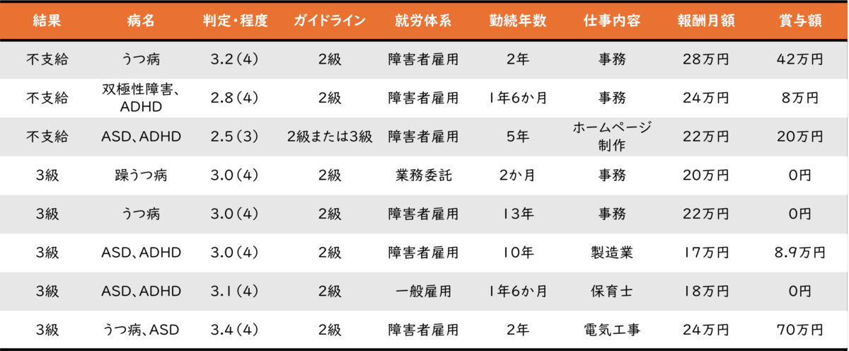 一般雇用のフルタイム勤務だと、精神の障害に係る等級判定ガイドラインに照らして3級相当であっても、就労状況を理由に不支給になることが多いです。一方、障害者雇用または障害者雇用と同等の働き方であれば、給与額(標準報酬月額)が40万円未満であれば就労状況は問題になることはなく支給決定していました。