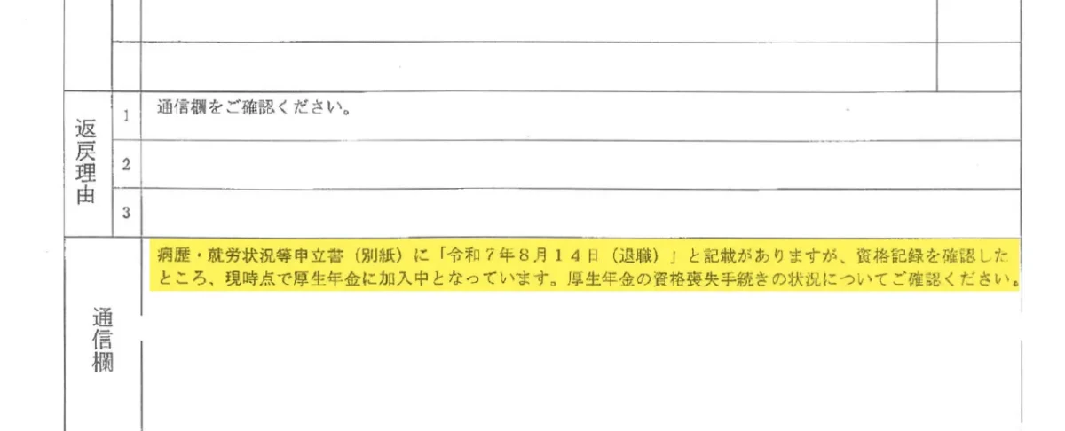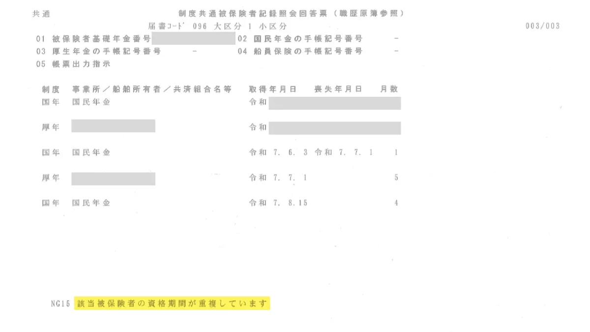 このような状態になっているのは、ご依頼者がきちんと国民年金・国保加入の手続きを行っている一方で、会社側が届出を出していないため喪失日が入っていないためです。