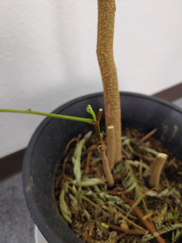 事務所においてある頂いた観葉植物ですが、乾燥に非常に弱いエバーフレッシュがお正月に枯れてしまい、かなりのショックでした。ネット情報などを調べ、枯れてしまった箇所を切って、放置していて春になったら芽がでることもある。という記事を信じて、事務所のベランダで乾燥しないように、おいておいたところ、小さな芽がでました。報われた気分と、小さな命の息吹を感じとてもうれしい一日になりました。花を感じた1日でした。