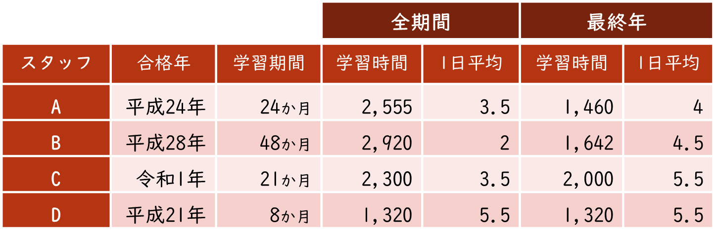 今回は、当社にも受験生がいることもあり、社労士試験合格に必要な学習時間がテーマです。下記は、当社の試験合格者4名の学習時間をまとめたものです。