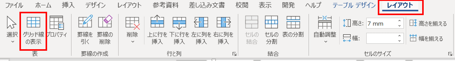レイアウトタブに切り替え、[グリッド線の表示]をクリックすると、テーブルの枠が見えるようになります。