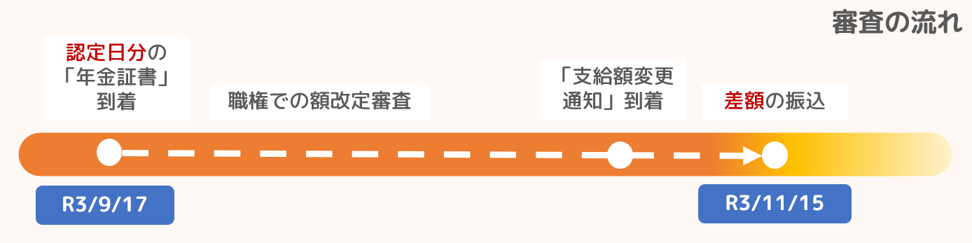 上記のケースでは、職権での額改定審査は障害認定日の認定の後に行われます。通常は、請求者に年金証書が届く頃に審査され、決定するまで1ヵ月程度を要します。無事に額改定が認定されると、現在の診断書現症日の翌月(令和3年6月)から2級に改定されます。その場合、令和3年11月15日(随時支払日)に3級と2級の年金差額が振込まれます。