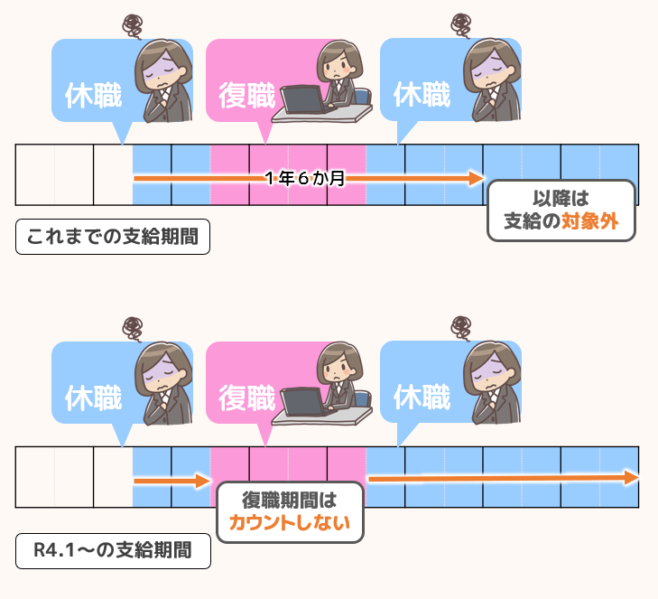 改正後は、復職期間を1年6ヵ月にカウントせず、「支給開始日から通算して1年6ヵ月となります」。これまでよりも期限に余裕がある分、回復ペースに合わせて復職時期を決めることができます。