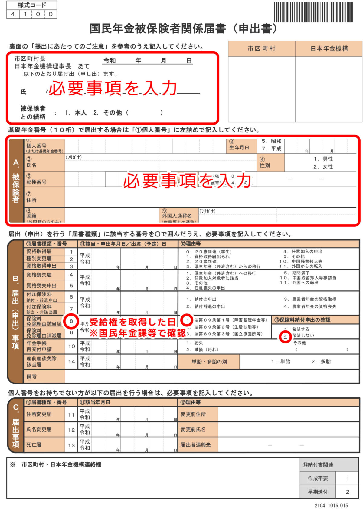 年金事務所の国民年金課または市町村役場の国民年金担当へ国民年金被保険者関係届書(申出書)(日本年金機構)を提出します。
