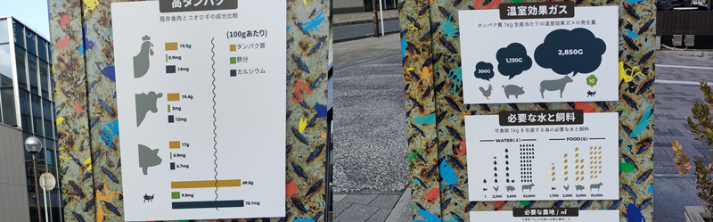 初めは、おもちゃか何かかと思いましたが、よくよく見ると本当に食べられる昆虫が売られています。値段は約1,000円前後ちょっとと高い感じもしますが、下図のように栄養価が高いだけでなく、温室効果ガスの排出も少なく、過食部分も多く、必要な水や肥料も少ない。大変、コスパのよい食べ物といえます。