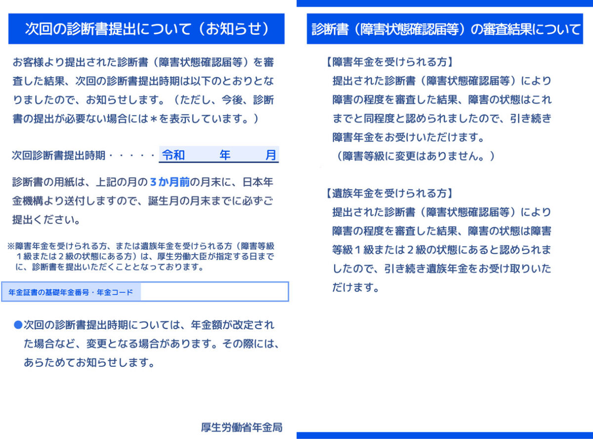 圧着ハガキを開いた左頁「次回の診断書の提出について(お知らせ)」に次回更新年月が、右頁「診断書(障害状態確認届等)の審査結果について」には、障害等級で引き続き障害年金を受給できる旨が記載されています。