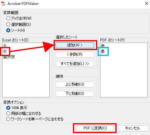 「Adobe PDFとして保存」をクリックしてメニューを開き、《Excelのシート》にある「裏」を選択し、[追加(A) >]をクリックし、《PDFのシート》に「表」「裏」が表示されている状態にしてください。