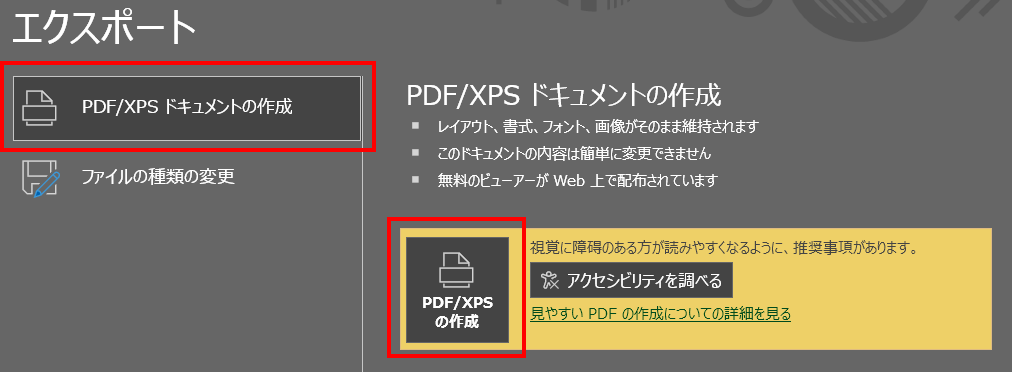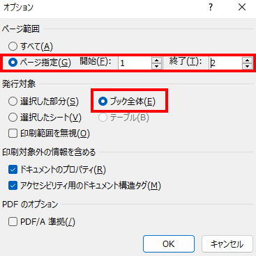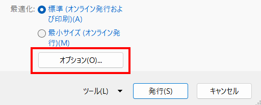 [PDF/XPS]の作成を選び、[オプション]をクリックします。