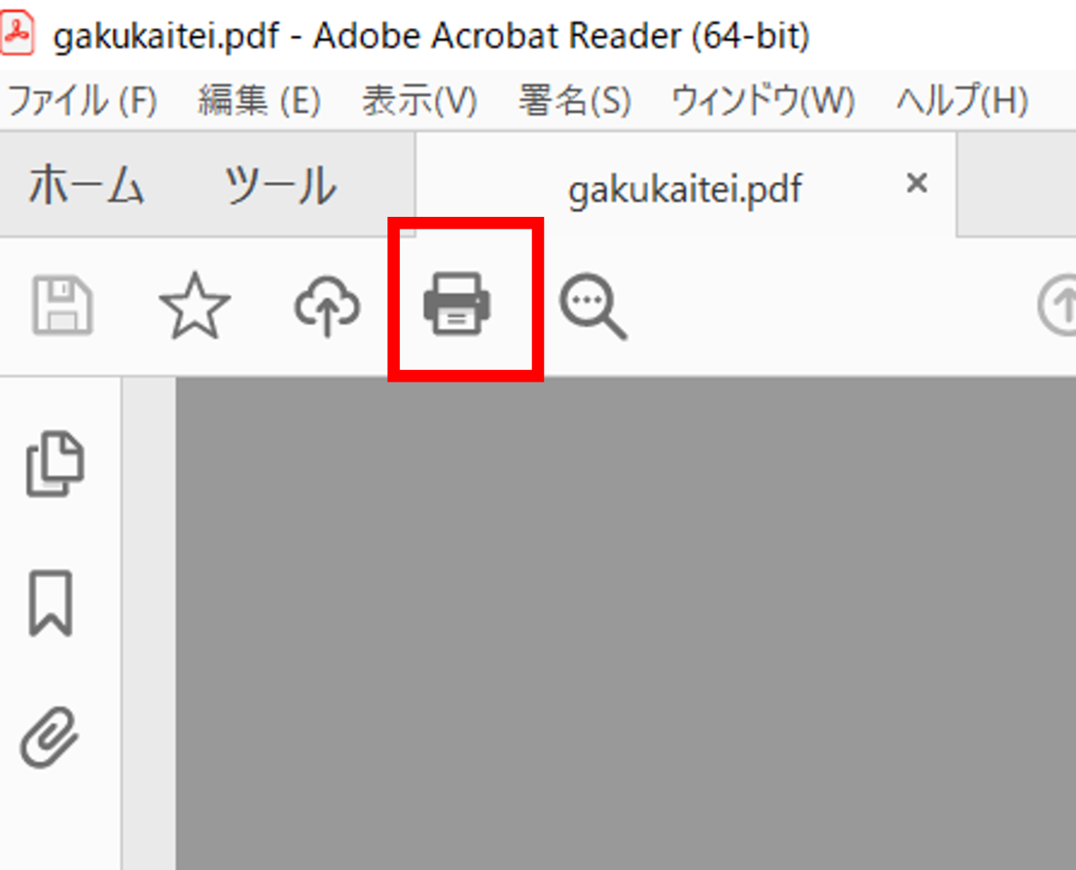 PDFファイルを開き、プリントのアイコン(図参照)のクリックや、[Ctrl]+[P]などで印刷メニューを開きます。