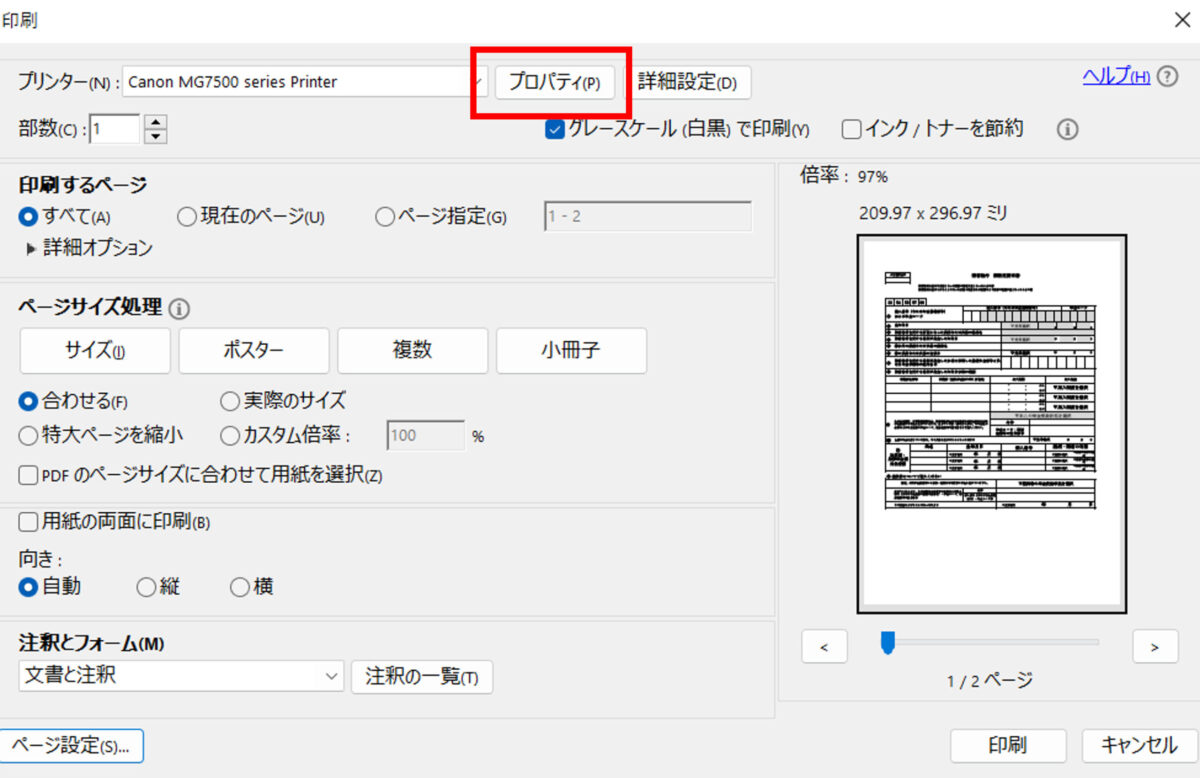 印刷の画面が出ますので、[プロパティ]からプリンターのメニューを開き、両面印刷を選択してください。