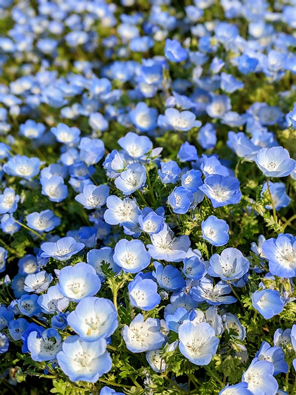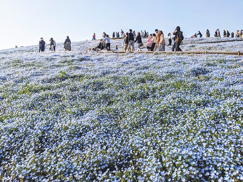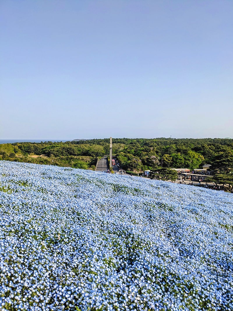 ひたち海浜公園はみはらしの丘というところが一面ネモフィラになっているので、下から見ると空の青と溶け合う絶景がみることができ、丘を登り上から見ると海の青と溶け合うもう一つの絶景をみることができます。
