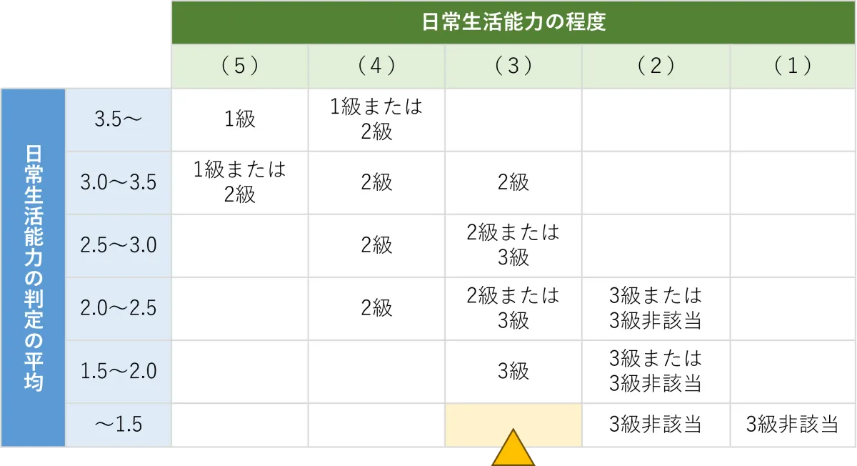 例えば、「日常生活能力の判定」は2.57、「日常生活能力の程度」は(3)の場合、【障害等級の目安】は「2級または3級」です。