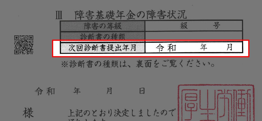 障害年金が決定して、年金証書が送付されると、決定した等級の下に「次回診断書提出(更新)年月」が記載されています。