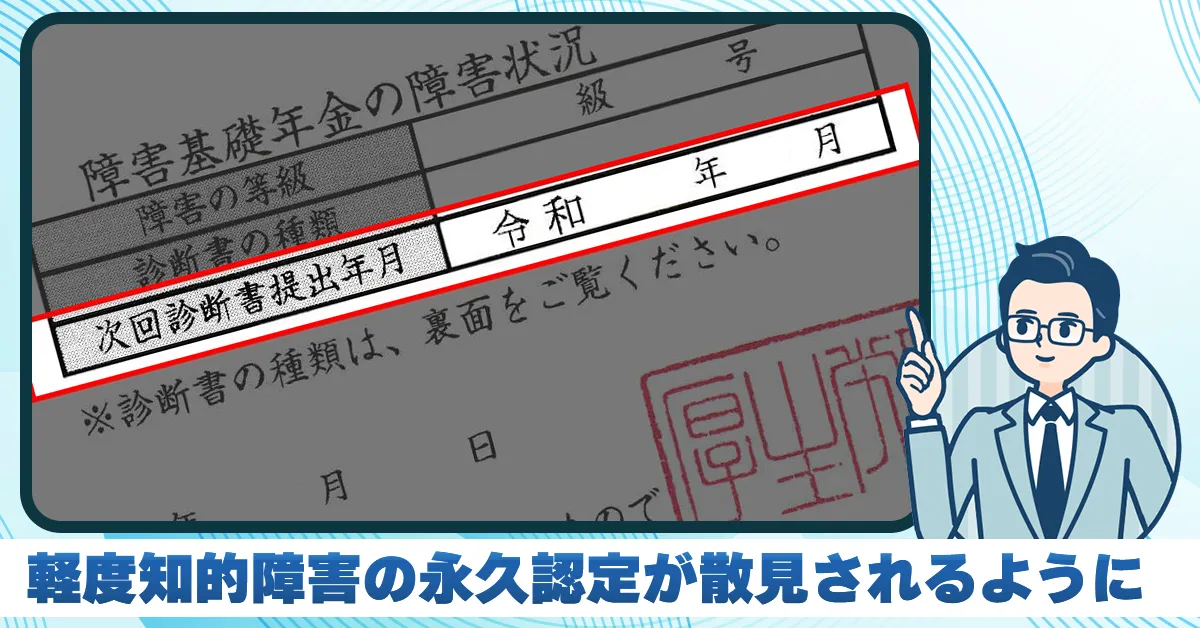 軽度知的障害の次回更新年月は3~5年になることが多く、うつ病などに比べると長めですが、永久認定はとても少ないです。