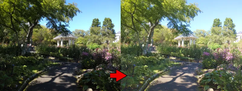左の写真は明るめの部分を基本値として撮影したものです。右側の木が黒すぎて潰れている感じですね。