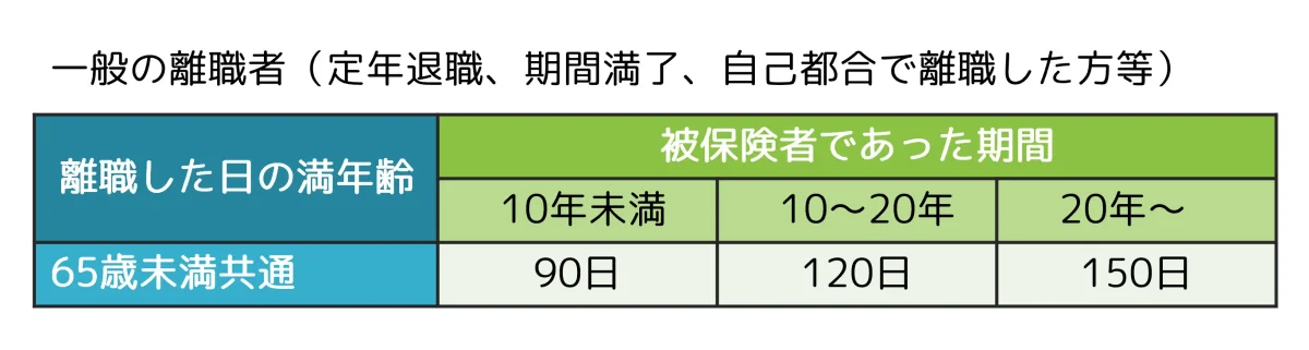 下図のように一般の離職者(定年退職、期間満了、自己都合で離職した方等)と就職困難者(障害をお持ちの方)では、所定給付日数や被保険者期間に大きな差があります。