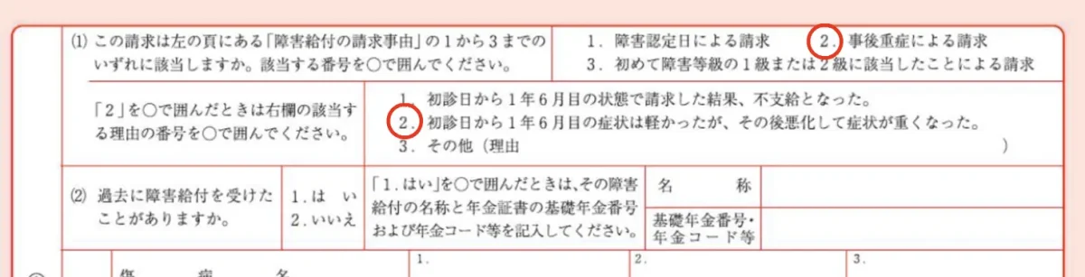 先に行った事後重症請求の際に提出した年金請求書「障害給付の請求事由」の項目は「事後重症による請求」を選択しています。さらに理由として「2.初診日から1年6月目の症状は軽かったが、その後悪化して症状が重くなった。」を選択していると思います。