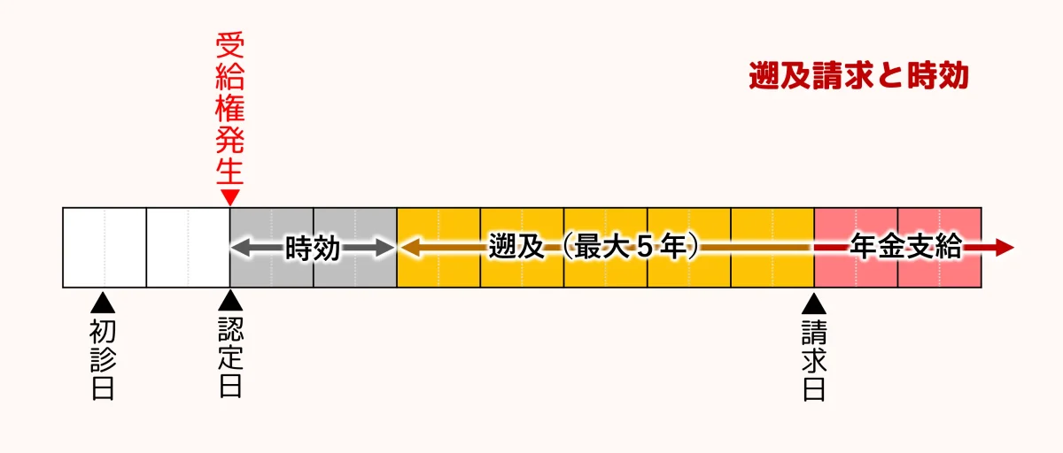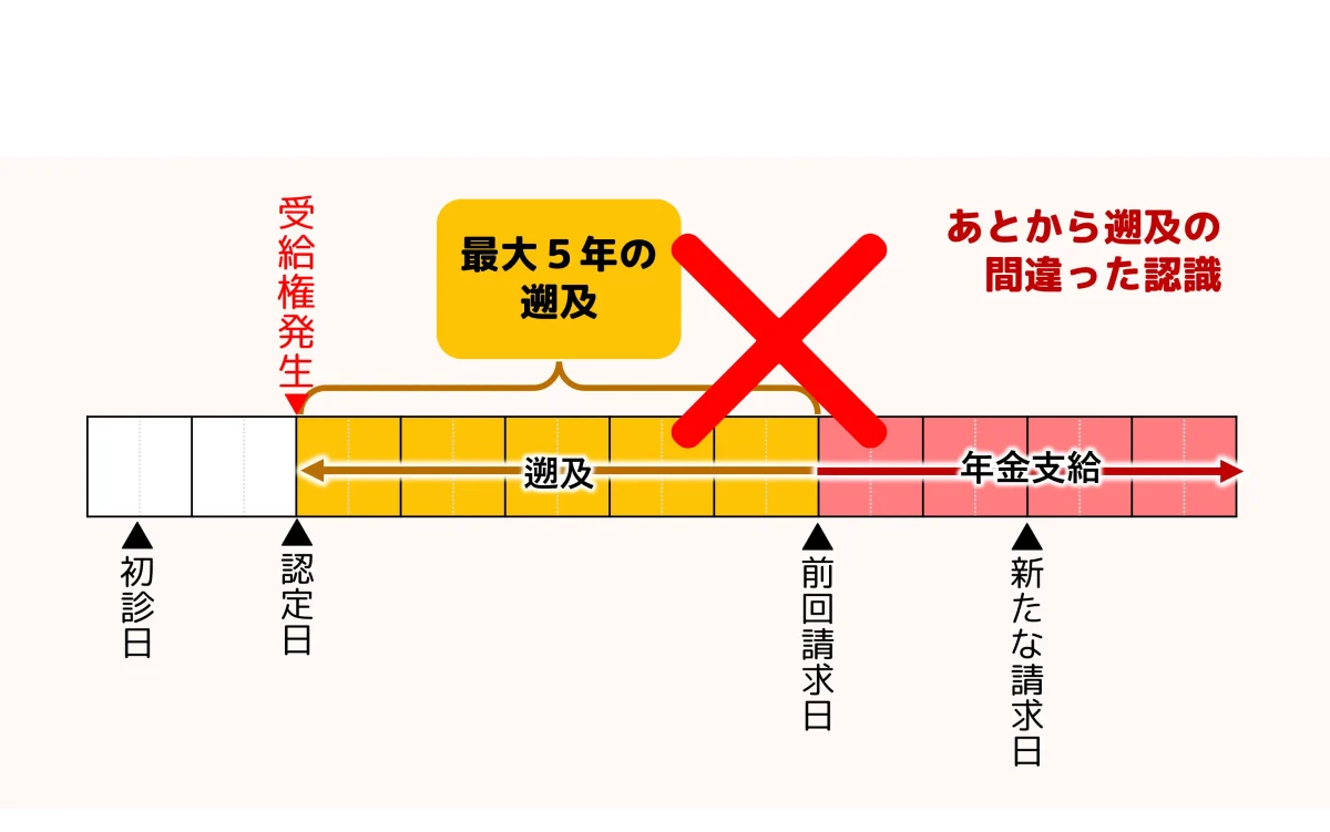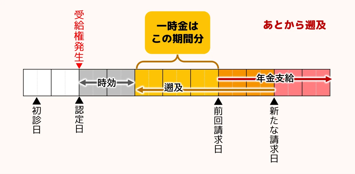 「あとから遡及」の場合、時効の起算点は前回請求日ではなく、新たな請求日になります。そうすると、5年分の年金一時金から前回請求日以降に受給している年金は既払いとして控除されるので、最大5年分の年金一時金は受け取れません。