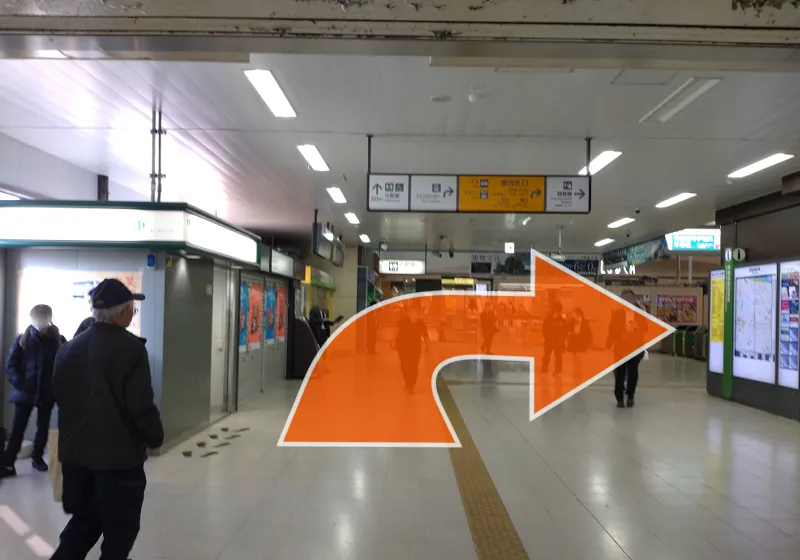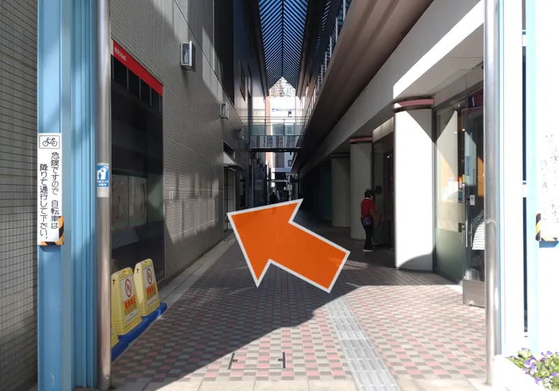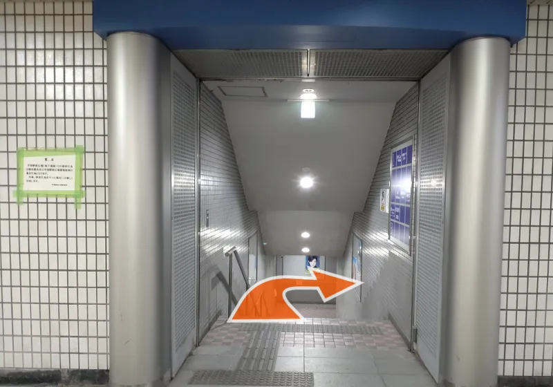 奥の階段へ向かう途中、上部が青い階段口があるので、そちらに曲がってください