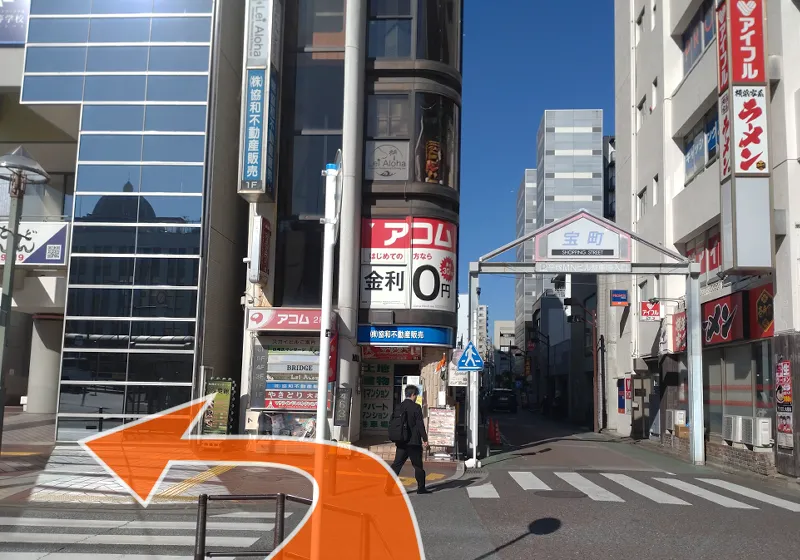 曲がる箇所です。宝町と書かれた門の先には行きません
