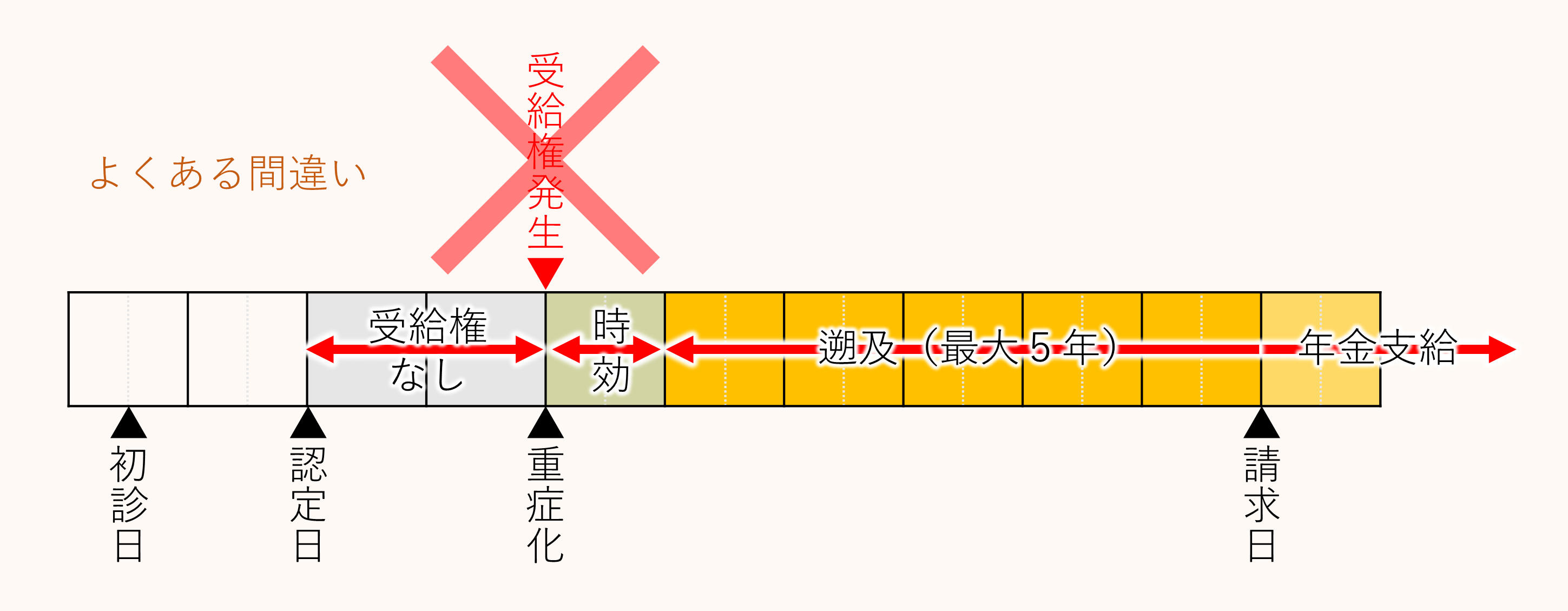 例えば障害認定日が8年前、重症化したのが6年前の場合でも、年金の時効である5年前までさかのぼって年金受給できるわけではありません。