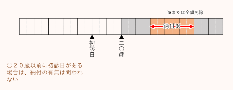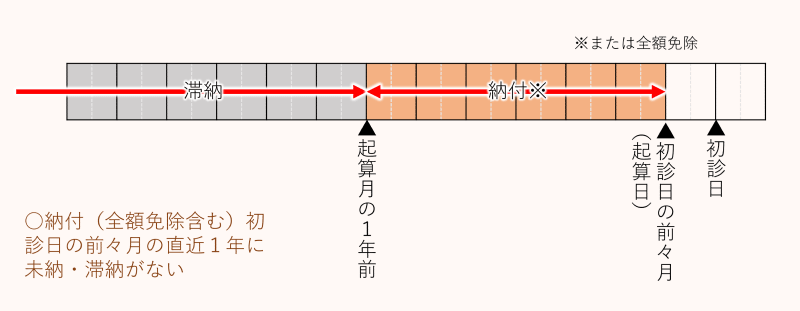2初診日が年金加入期間(国民・厚生)であり、初診日の属する月の前々月までの過去1年間に未納・滞納がないこと(65歳未満に限る)