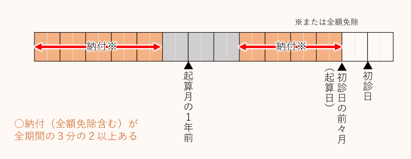 1初診日が年金加入期間(国民・厚生)であり、初診日の属する月の前々月までの納付月(免除含む)が全期間の3分の2以上あること