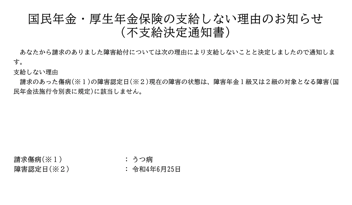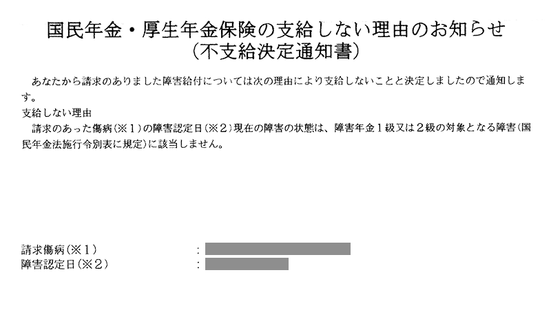 「あなたからありました障害給付については、次の理由により支給しないことと決定しましたので、通知します。」