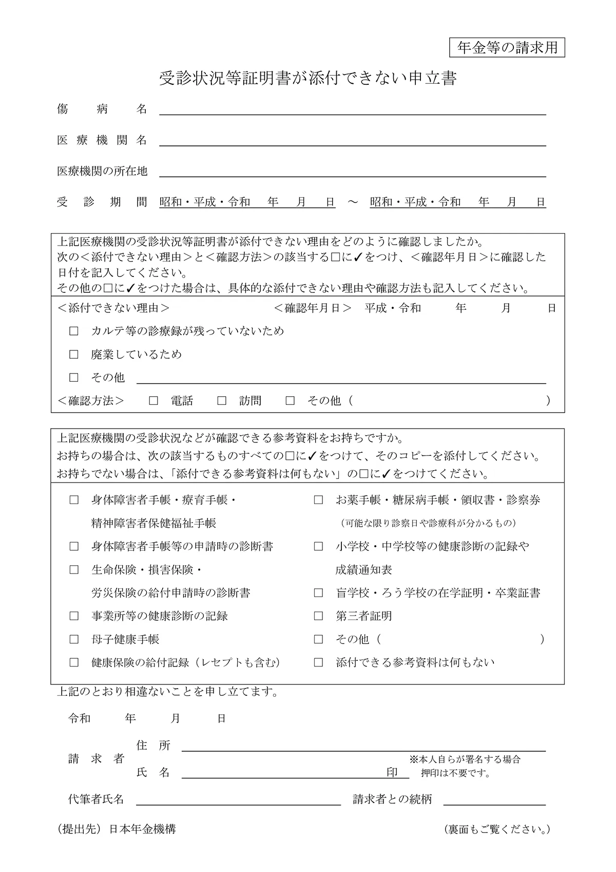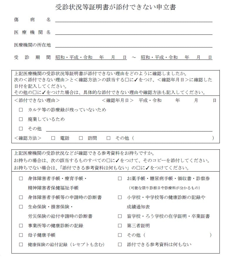 「受診状況等証明書が添付できない申立書」はその名の通り、なんらかの理由で受診状況等証明書が提出できないことを申し立てる書類です。