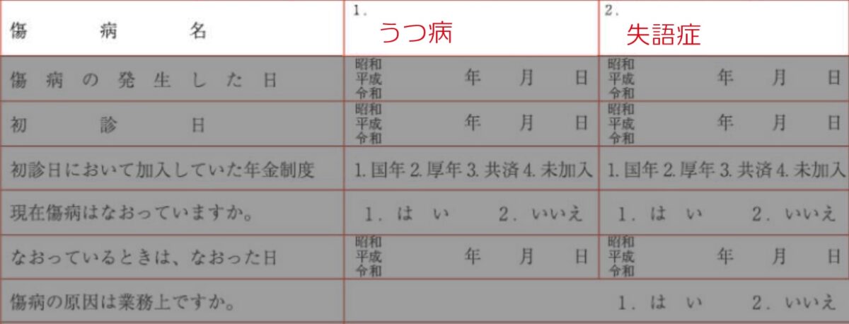 うつ病と言語障害など、別の分類の障害が複数ある場合は、それぞれ欄を分けて記載します。