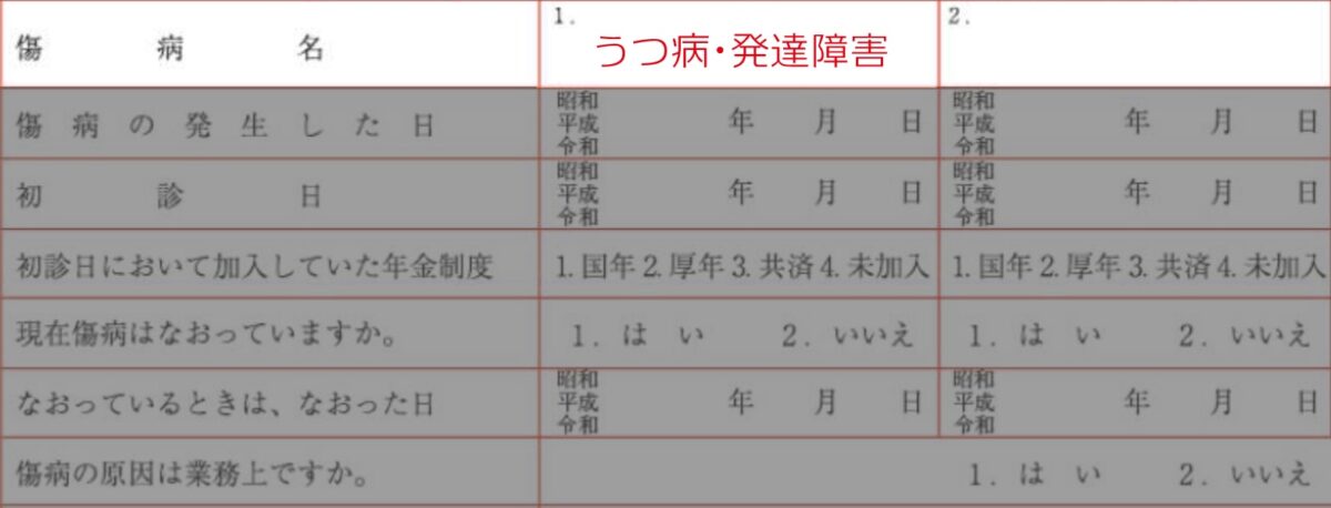 うつ病と発達障害など、同じ分類の障害として傷病名が2つ以上ある場合は、1つの欄にすべて記載します。