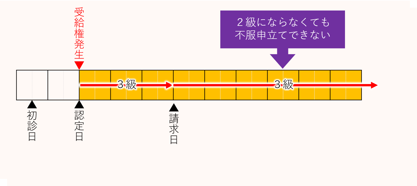 例えば、「認定日3級/現在2級と自覚していたのに、両方3級になってしまった」というようなケースで、現在の等級に対する不服申立てを行っても、不適法として却下されてしまいます。