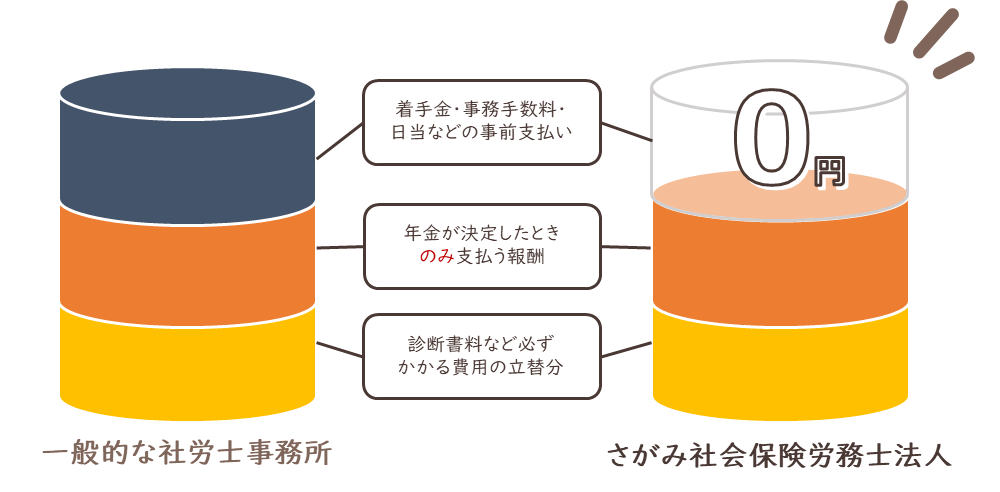 当社のモットーは「受け取るべき人が、あたりまえに受け取れる障害年金制度の実現を目指す」です。 着手金を支払う余裕のない方でも障害年金のプロにお任せいただき、安心して療養に専念できるよう「着手金0円の完全成果報酬制」は守り抜きます。
