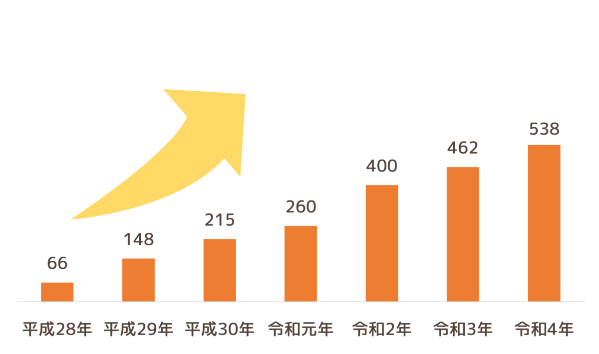 順風満帆とはいきませんでしたが、障害年金に関するご相談やお悩みに真摯に耳を傾け、他事務所に断られたというような難易度の高い案件でも丁寧に課題をひとつずつ解決することによりノウハウを蓄積することができました。 その結果、受給率は98%以上の事務所に成長し法人化することができたのです。 令和4年からは請求件数は年間約500件を超えるようになり、令和4年11月には請求実績が2,000件を突破しました。