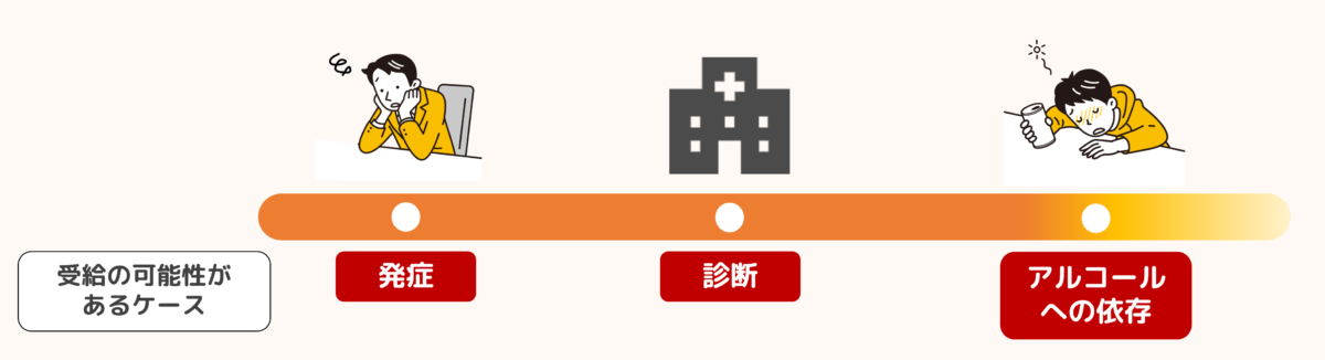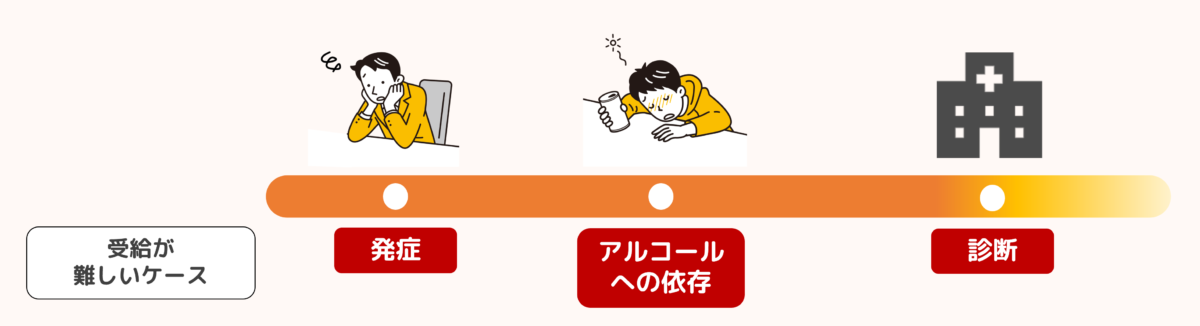 メンタルの不調を感じていても、医療機関に行かず、先にアルコールを頼ってしまったというケースでは、受給が難しくなります。