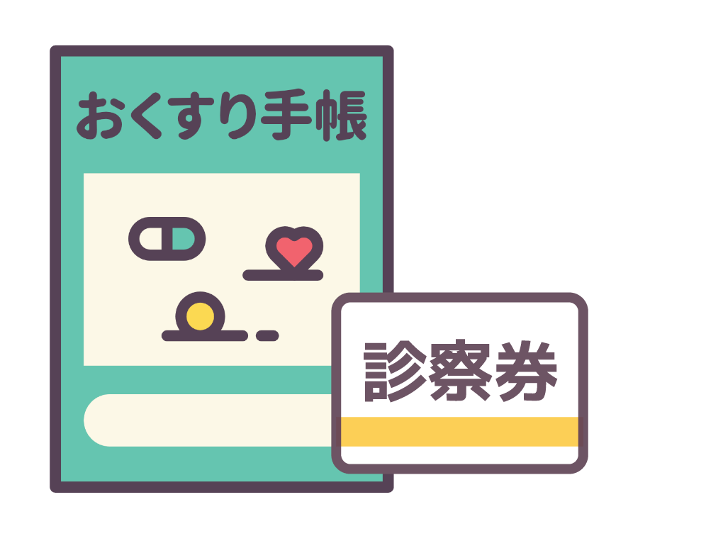 お薬手帳・糖尿病手帳・領収書・診察券(可能な限り診療日や診療科分かるもの)
