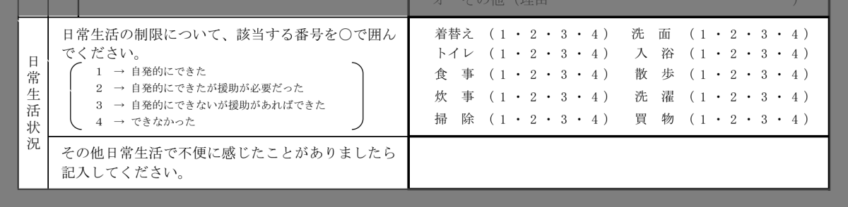 この項目で聞かれていることは、診断書の「日常生活能力の判定」によく似ています。