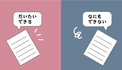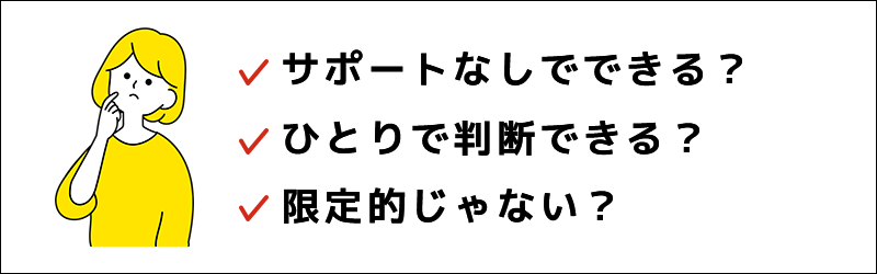 なにができないのか、どういった困難があるのか、実際の生活範囲だけでなく、いわゆる一般的な社会生活を行うとしたらなにができないのか、といった点にも目を向けてみましょう。