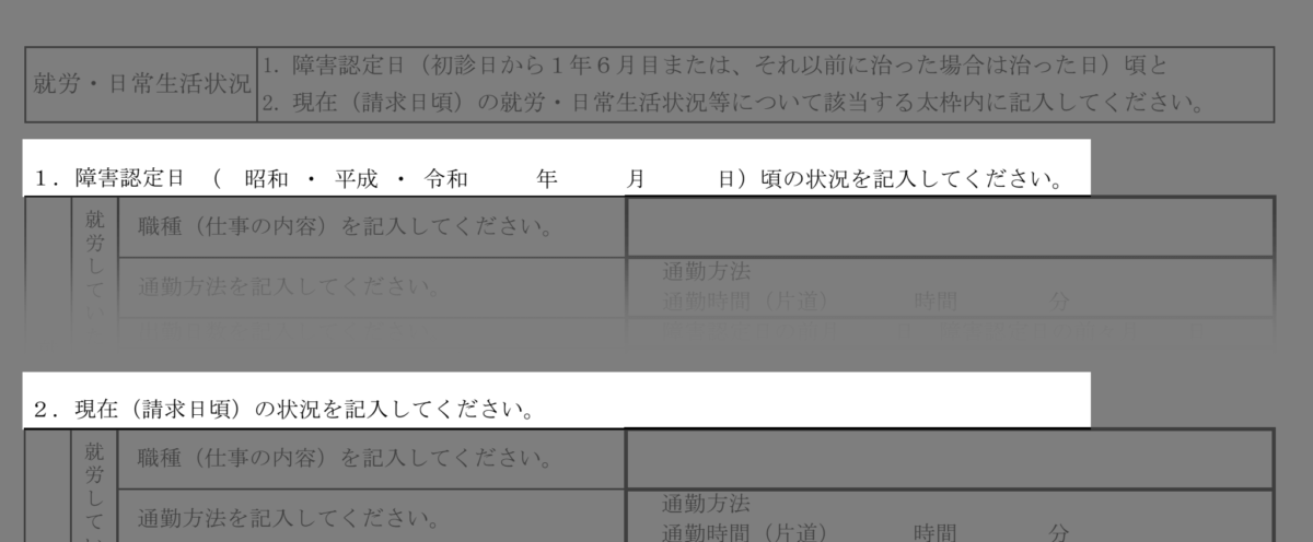 この欄は「2.現在(請求日頃)」の項目と一緒になっていますが、「1.障害認定日頃」のみ記入する場合でもこちらの欄に記入して問題ありません。