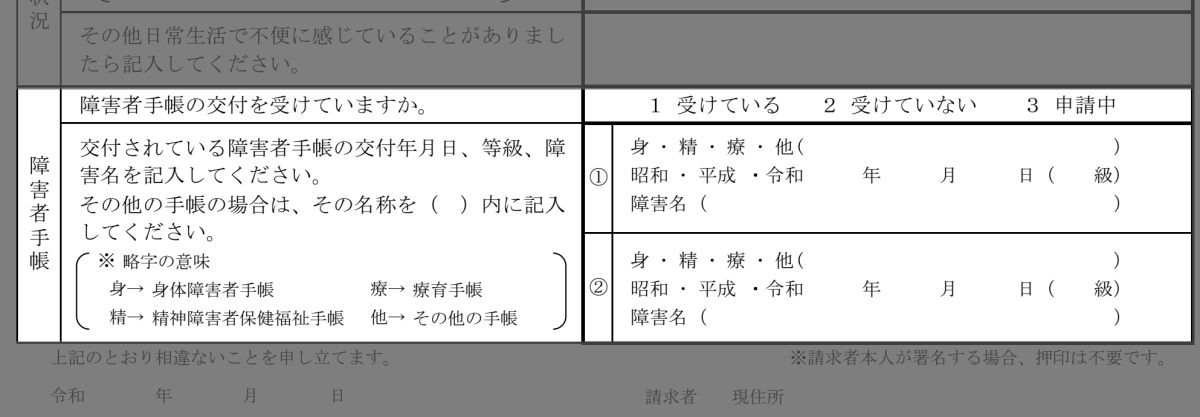 「2.現在(請求日頃)」の欄についている「障害者手帳」の欄の記入漏れにご注意ください。